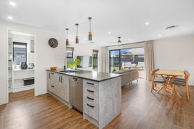 The kitchen is the star of the show, complete with stone benchtops and a walk-in pantry, flowing seamlessly to a bright, open-plan dining and living area that connects effortlessly to a sunny deck through triple