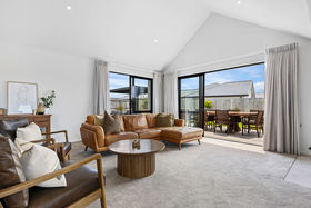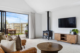 From the moment you step inside, the main living zone makes a statement. Cathedral ceilings enhance the sense of space while flooding the room with natural light, creating an inviting heart of the home. A woodburner with heat transfer provides ambience and efficiency through the cooler months, while a discreet ceiling cassette heat pump ensures year-round climate control without compromising the clean lines of the design.